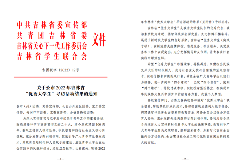 希望“优秀大学生”珍惜荣誉、再接再厉,争做担当民族复兴大任的时代新人,成为社会主义核心价值观的坚定信仰者、积极传播者和模范践行者。希望学校青年学生以他们为榜样,努力练就过硬本领,积极投身强国伟业,以实际行动践行初心使命,展现青年大学生的风貌和担当,勇敢肩负起时代和人民赋予的重任,以青春力量、青春行动庆祝建团100周年,喜迎党的二十大。